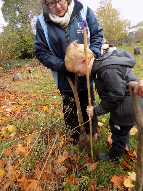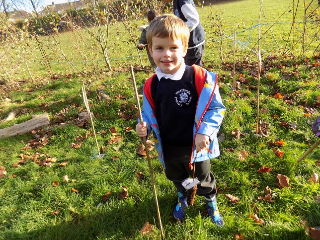 Brrrrr! It was cold this week at Forest School when Fox Class and Owl Class had the opportunity to plant tree saplings. We had Oak, Wild Cherry, Grey Willow , Field Maple , Silver Birch and Rowan Trees to plant. They were only small but in five years time, they might be as tall as us when we are in Year 6. Our lovely Year 6 assistants were fantastic support, digging deep for us to make the planting easier, they also planted their own saplings. The learning did not stop there! After the planting we got creative with clay, adding natural materials, like conkers, grasses and tree seeds.
