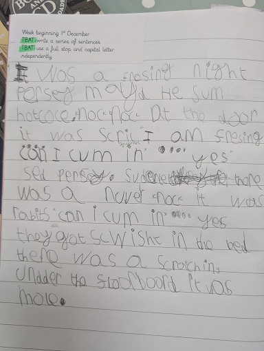Our focus book this week is One snowy night by Nick Butterworth. We have all enjoyed independently writing the beginning of the story and focusing on remembering to use capital letters at the start and full stops at the end of our sentences.
